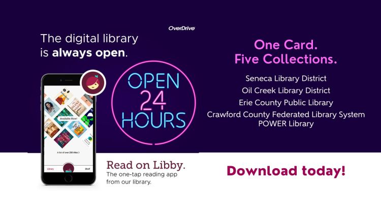 Our Libby by OverDrive collection (through Oil Creek Library District) now offers 9,000+ e-books, 1,000+ digital audiobooks, and 2,500+ magazines. Never any late fees; items check back in automatically at the end of the loan period. Place holds and receive an e-mail notification when item is available.